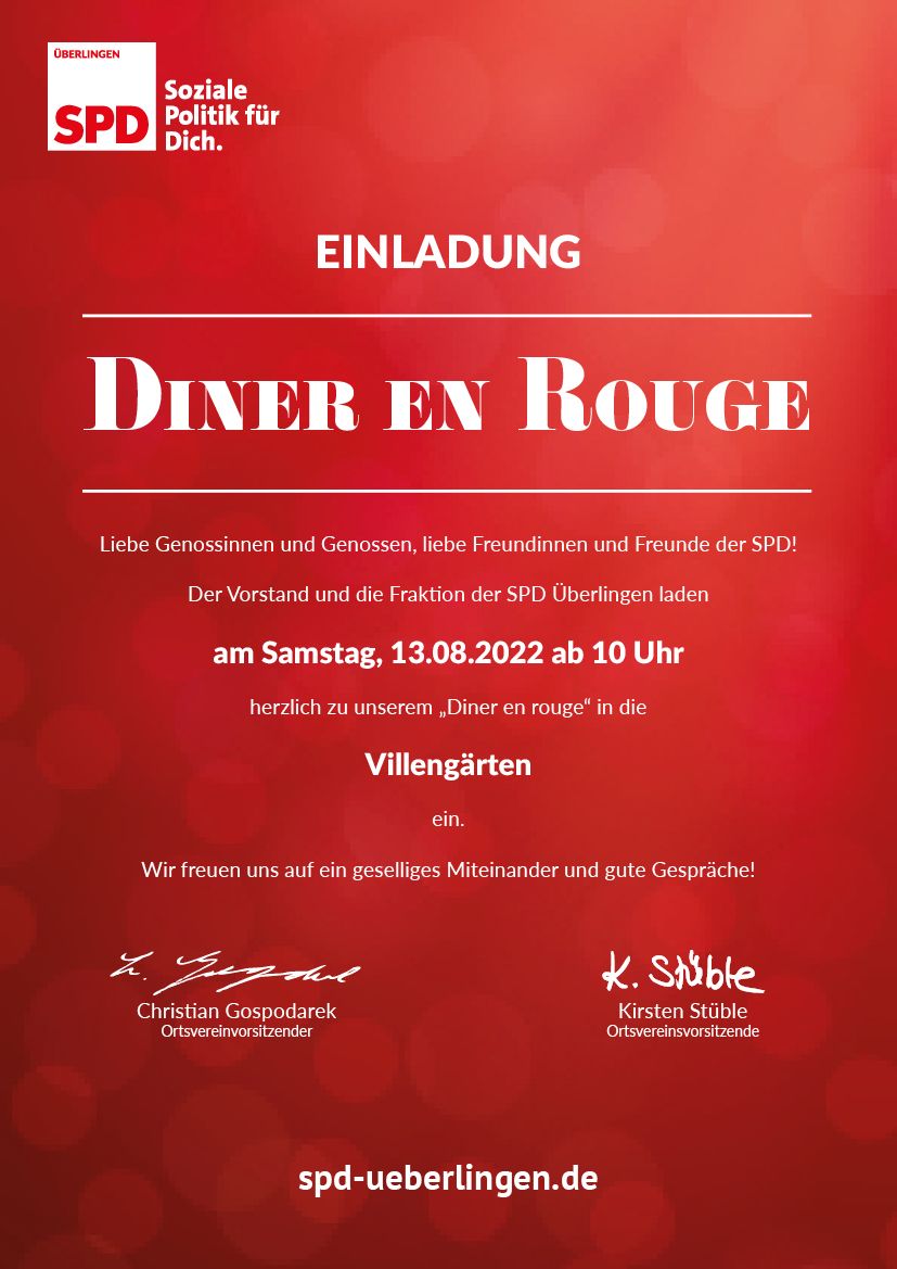 Der Vorstand und die Fraktion der SPD Überlingen laden am Samstag, 13.08.2022 ab 10 Uhr herzlich zu unserem „Diner en rouge“ in die Villengärten ein.